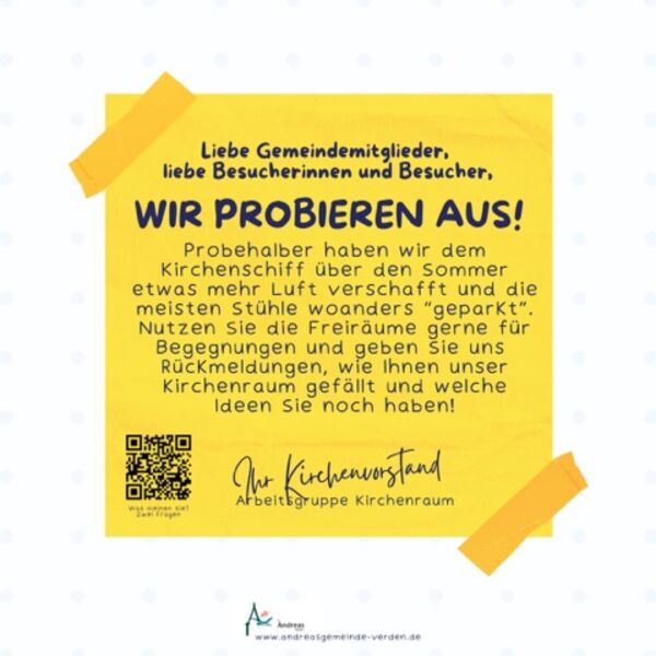 Wir probieren aus! Probehalber haben wir dem Kirchenschiff über den Sommer etwas mehr Luft verschafft und die Stühle woanders "geparkt". Geben Sie uns gerne Rückmeldung u/o Ideen. Vielen Dank.